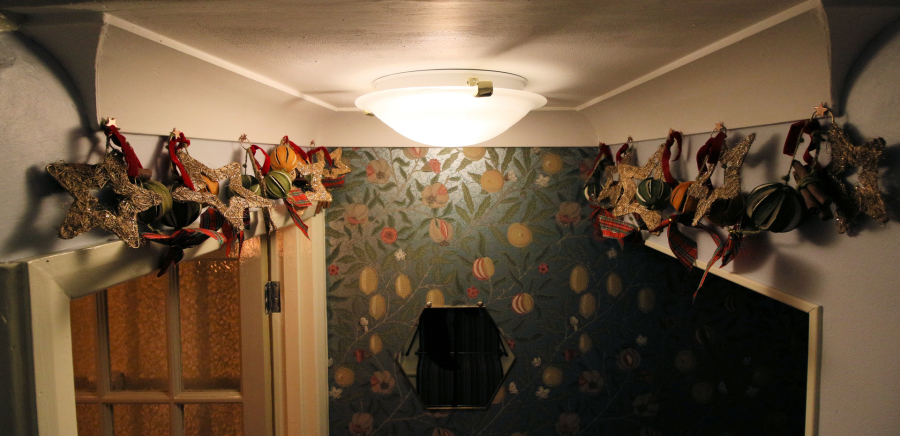 The decoration throughout the house is loosely based on the Arts & Crafts movement (apart from the ‘Jack & Jill’ bathroom, which is entirely modern). The wallpaper and most of the fabrics are William Morris original patterns, and the furniture is in oak, in a plain artisan style consistent with the Arts & Crafts movement. Most of the lighting has Tiffany glass shades, a stained-glass technique involving copper foil and lead solder developed in New York by Louis Comfort Tiffany in 1878.